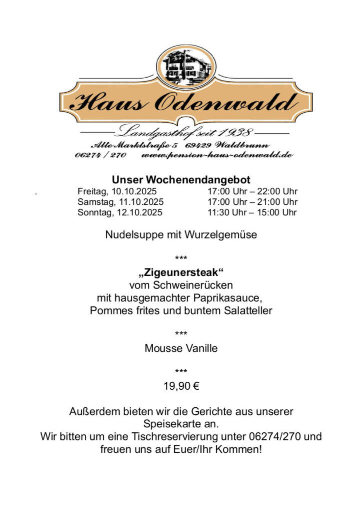 Der Landgasthof Haus Odenwald befindet sich im anerkannten Luftkurort Waldbrunn, in mitten der reizvollen Landschaft des Odenwaldes. Circa 3 Kilometer entfernt befindet sich der Katzenbuckel. Dieser ist mit seinen 626m der höchste Berg im Odenwald.