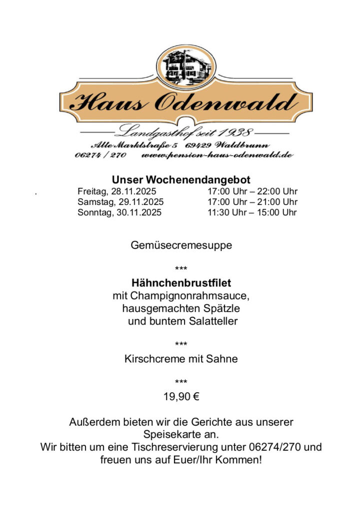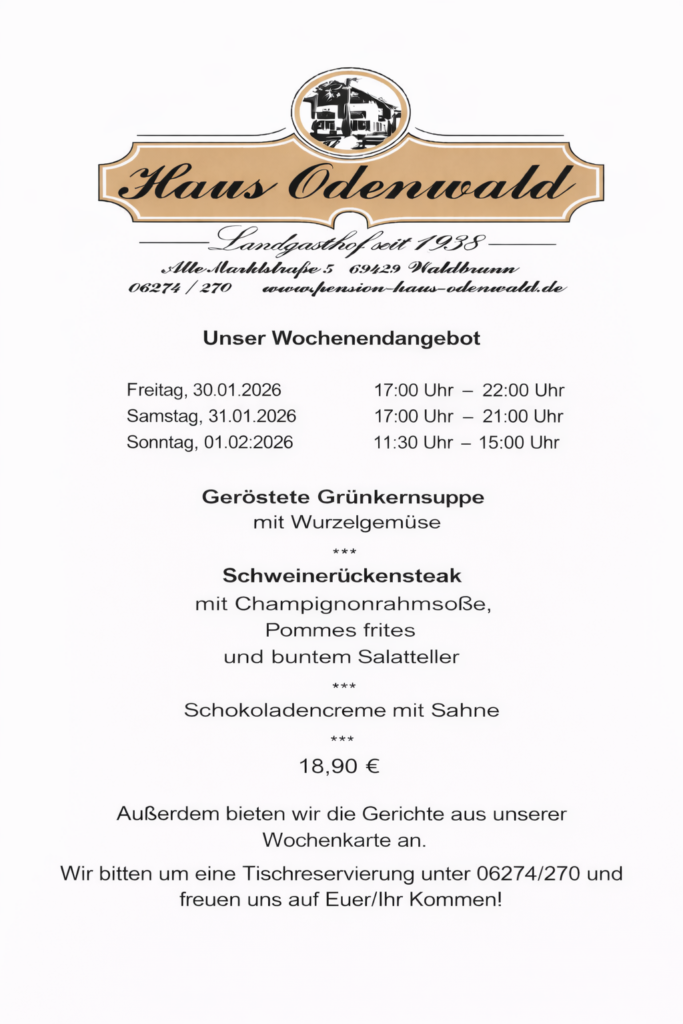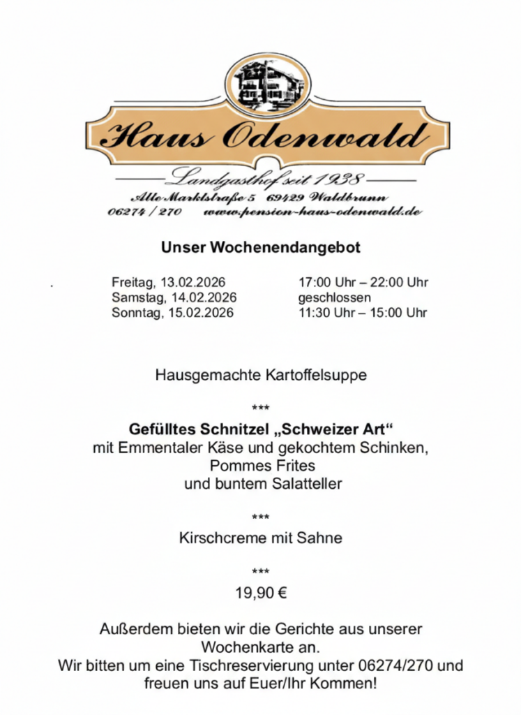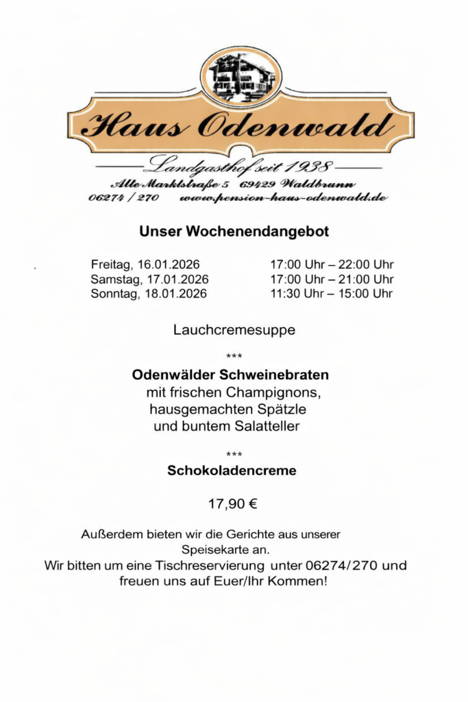 Wir heißen Sie herzlich willkommen im Landgasthof Haus Odenwald. Traditionsreich – familiär– ländlich. Das sind die charakteristischen Merkmale des „Haus Odenwald“.