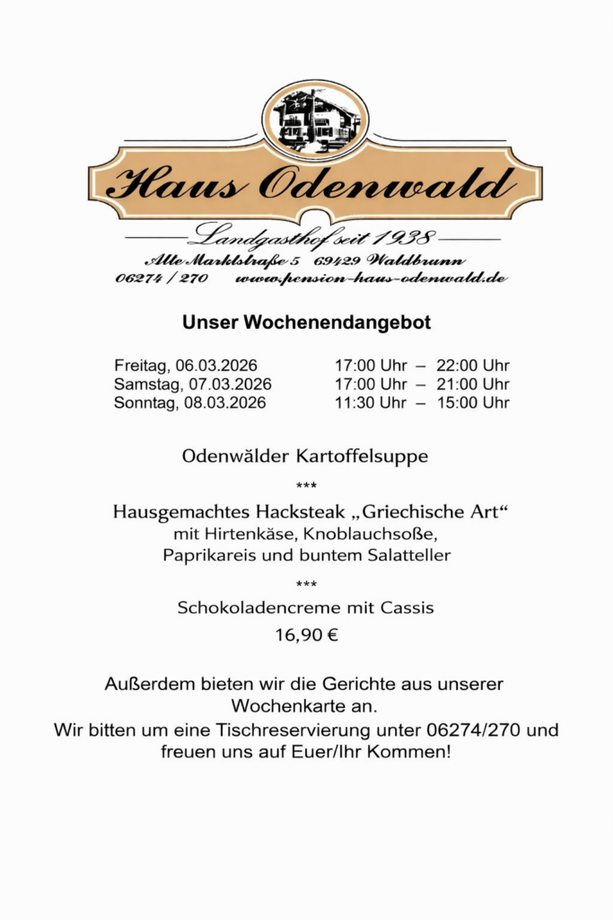 Der Landgasthof Haus Odenwald befindet sich im anerkannten Luftkurort Waldbrunn, in mitten der reizvollen Landschaft des Odenwaldes. Circa 3 Kilometer entfernt befindet sich der Katzenbuckel. Dieser ist mit seinen 626m der höchste Berg im Odenwald.